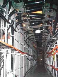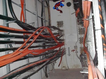 On the left you can see, near the ceiling, the many grey cables from the individual blocks on the VMDF feeding into a large black splice case where the pairs are tied, one by one, by hand, to the pairs of the big black underground cables that lead out to the customers.