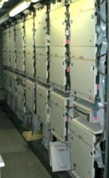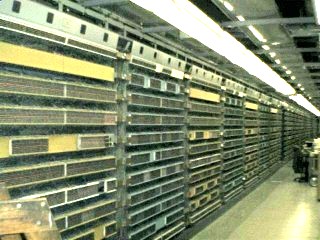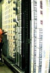 Show here are a COSMIC frame, and an older standard MDF (Main Distribution Frame).  This is the vertical side, the VMDF, which traditionally has blocks terminating carrier bays and underground cables.  The other side of the MDF is the HMDF, with the blocks mounted horizontally traditionally terminating the central office equipment.  A medium size frame will have between 100,000 and 1,000,000 jumper wires running from one block to another to tie any piece of equipment to any cable pair or carrier channel.  Or, in the case of DSL, from an equipment block supplying the dial tone, to a splitter block to add on the DSL signal, and then to a cable pair going out to the customer.  No jumper is placed or removed without a service order.  Every jumper is in a database.  Without accurate record keeping it would be impossible to maintain the MDF.
